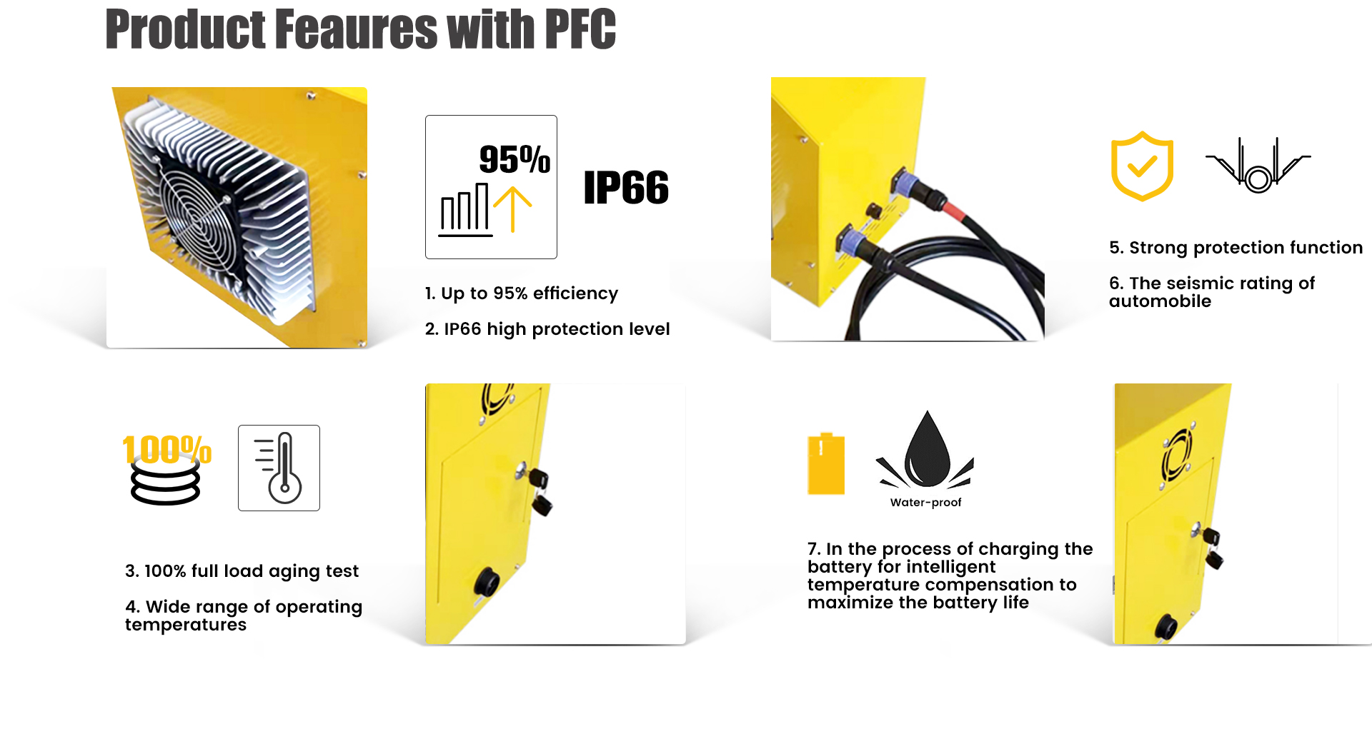 DCNE Q2-6.6KW on board charger is with broad input voltage/input broad voltage-AC90V-265V, could be applied in the all world. It is equipped with the CAN BUS communication, could connect battery BMS system, smart/intelligent charger and customer could choose it or not. The output voltage is DC48V-440V,the output current is 20A-85A. This type is developed and produced for some light vehicles such as glofcart charger,clubcart charger, forklift charger, electric trucks, electric tour bus, electric yacht, cleaning machines, crane charger or Uninterruptible Power Supply (UPS), solar energy, wind power dynamo and electric communication system on the railway,marine charger, military charger. It is a stackable charger of 3.3KW. Applying for all kinds of betterries/battery charger, for example, LTO, LiFePO4, NCM, AGM,GEL, Flooded lead acid , fully-sealed lead acid battery. It could be applied outdoor, it is water-proof, shock-proof,explosion-proof,dust-proof, has passed the international standard-IP67, also with PFC. The module is equipped with an advanced interleaved APFC active power factor correction circuit, which makes the utilization rate of electrical energy close to 1 during charging and reduces the harmonic pollution to the common grid. It is a light weight charger with smart function, one-one charging, to protect your battery extremly, longer it’s life at the best. It is also with follwing features:
